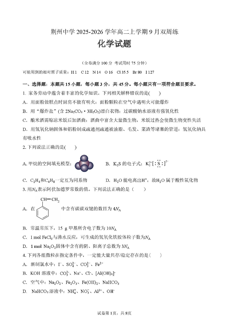 湖北省荆州中学2025-2026学年高二上学期9月双周练(月考)化学.pdf