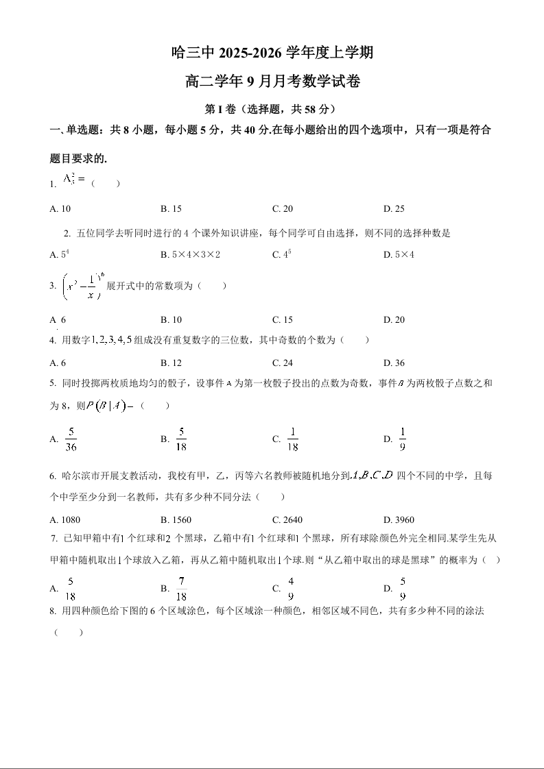 黑龙江省哈尔滨市第三中学校2025-2026学年高二上学期9月月考 数学.docx