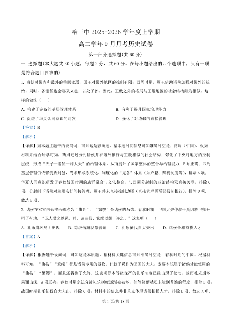黑龙江省哈尔滨市第三中学校2025-2026学年高二上学期9月月考 历史答案.docx