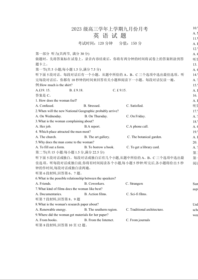 黑龙江省牡丹江市第一高级中学2026届高三上学期9月月考 英语.docx