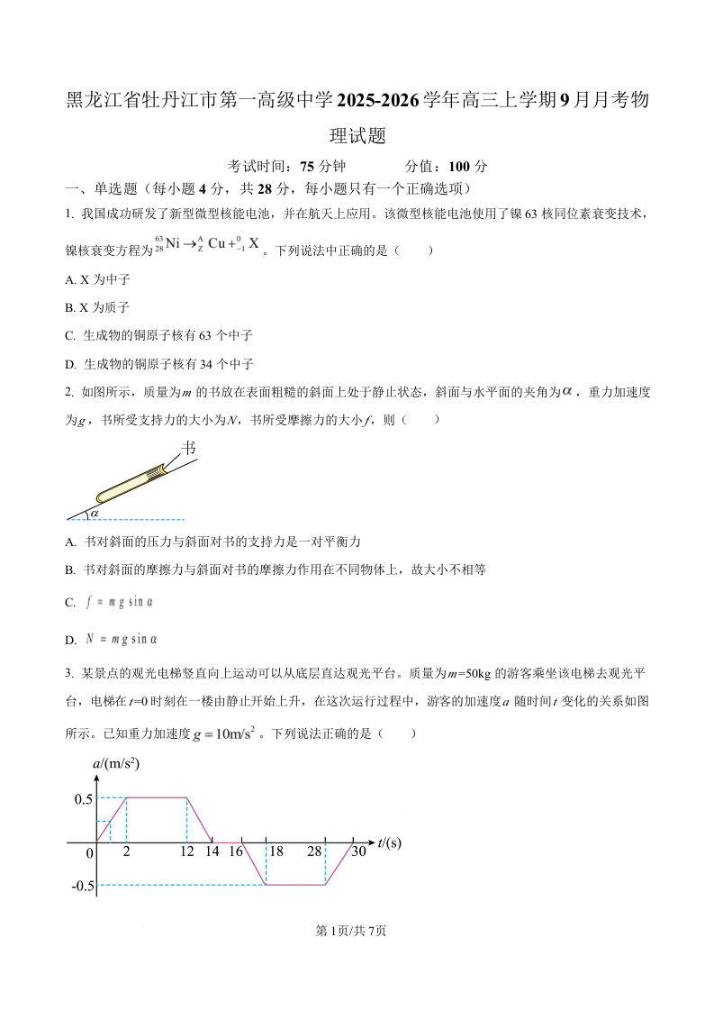 黑龙江省牡丹江市第一高级中学2026届高三上学期9月月考 物理.docx