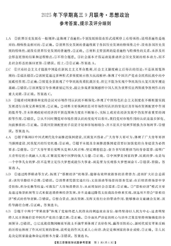 湖南天壹名校联盟2025年下学期高三9月联考 政治答案.pdf