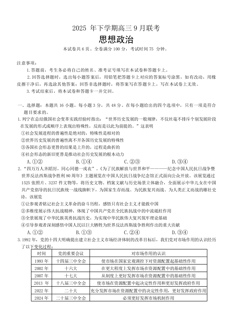 湖南天壹名校联盟2025年下学期高三9月联考 政治.docx