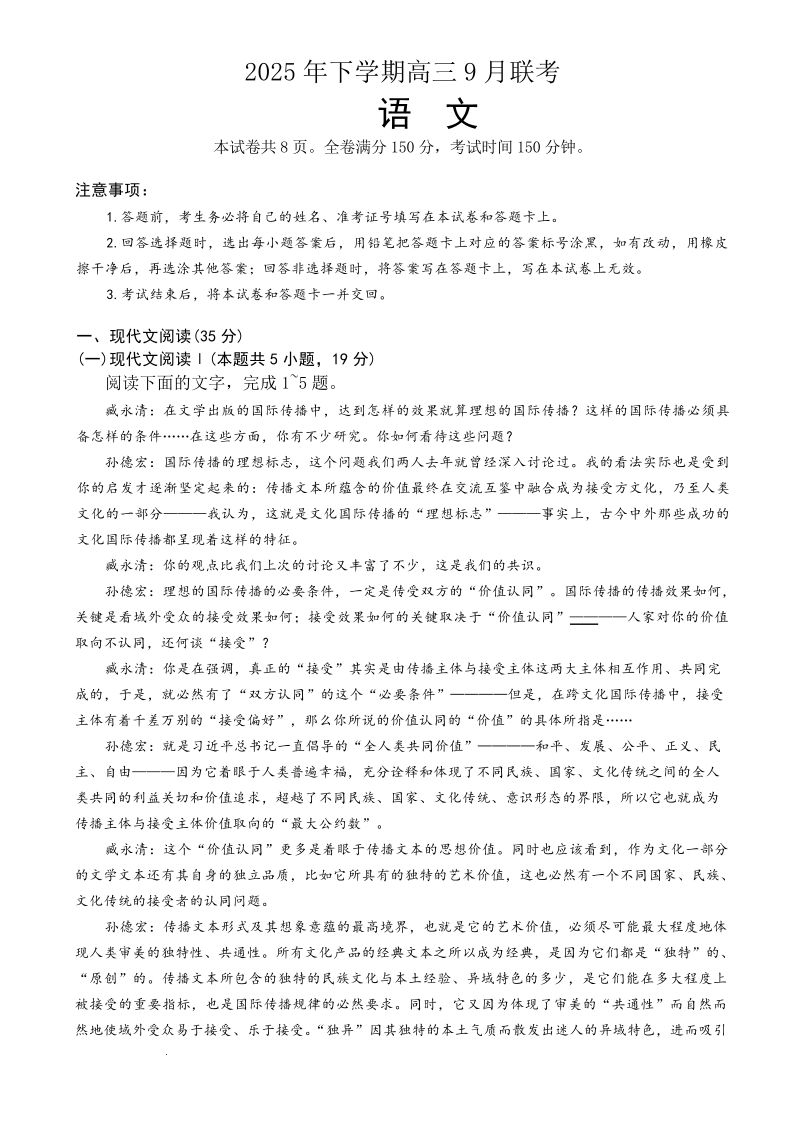 湖南天壹名校联盟2025年下学期高三9月联考 语文.pdf
