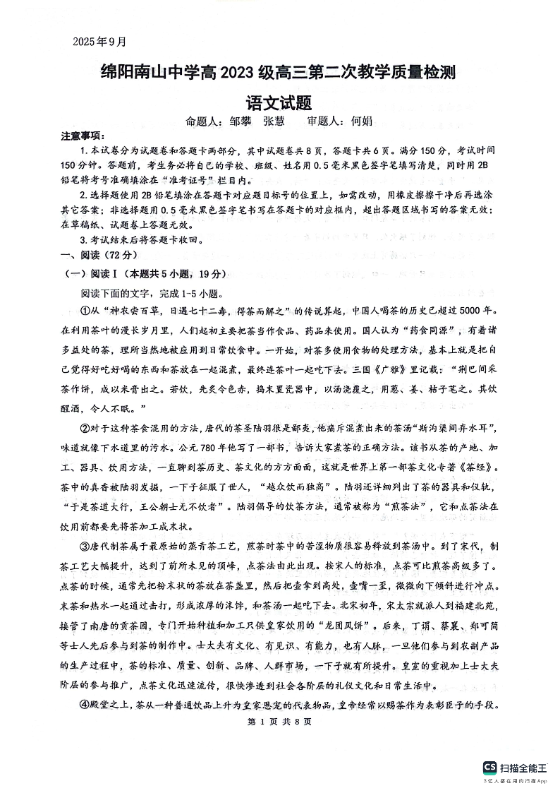 绵阳南山中学高2023级高三第二次教学质量检测 语文试题(含答案).pdf