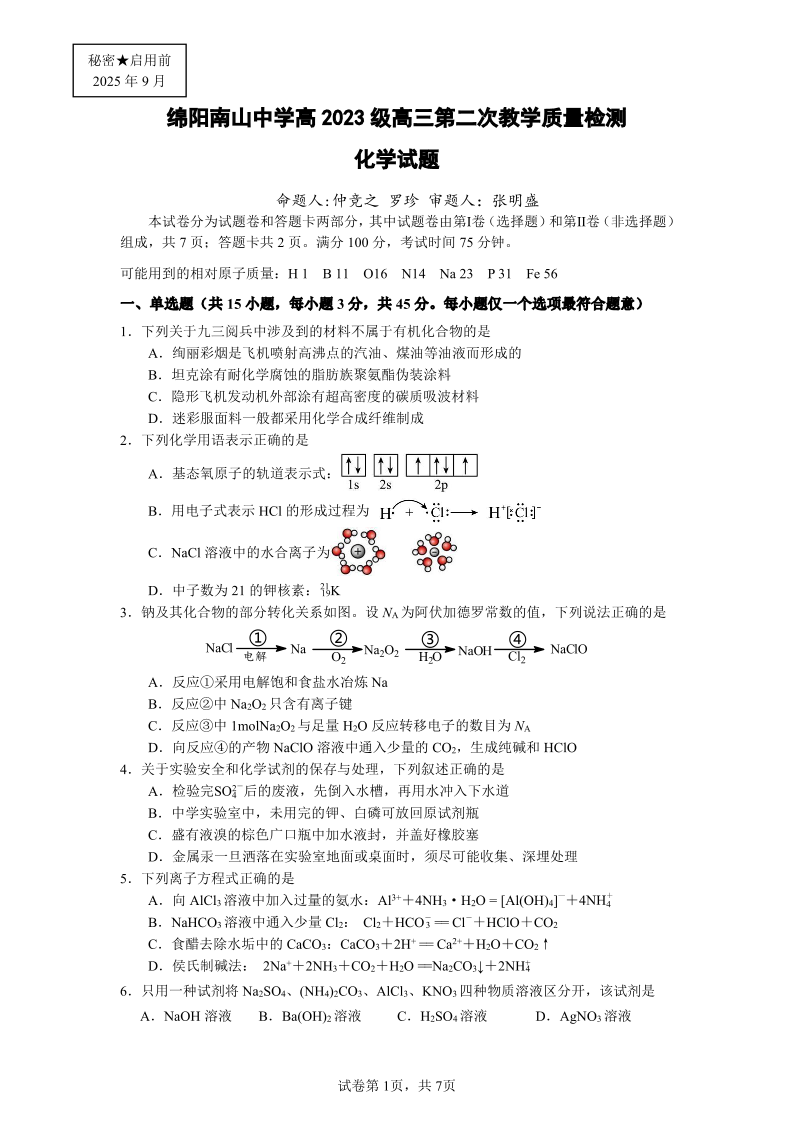 绵阳南山中学高2023级高三第二次教学质量检测 化学试题(含答案).pdf