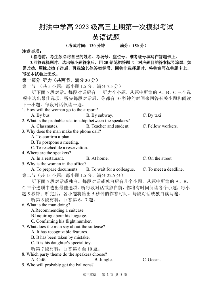 射洪中学2026届高三上学期9月第一次模拟考试 英语.docx