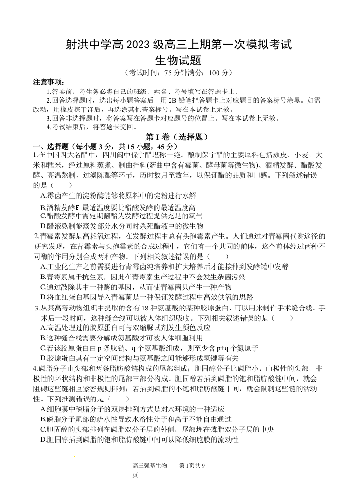 射洪中学2026届高三上学期9月第一次模拟考试 生物.docx