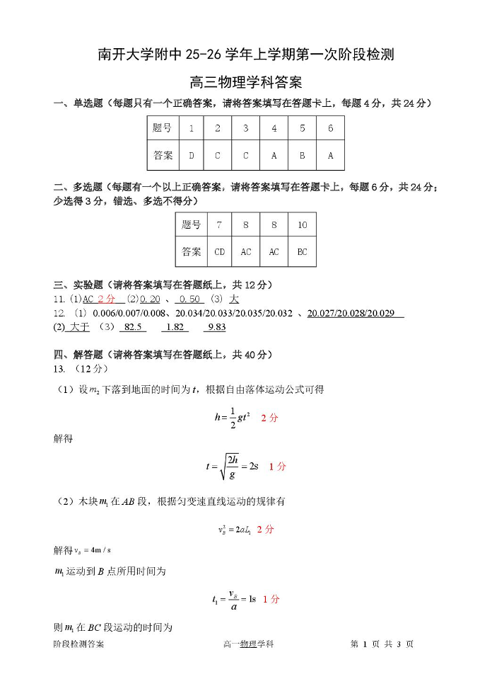 天津市南开大学附中2025年高三上学期第一次阶段检测 物理答案.pdf