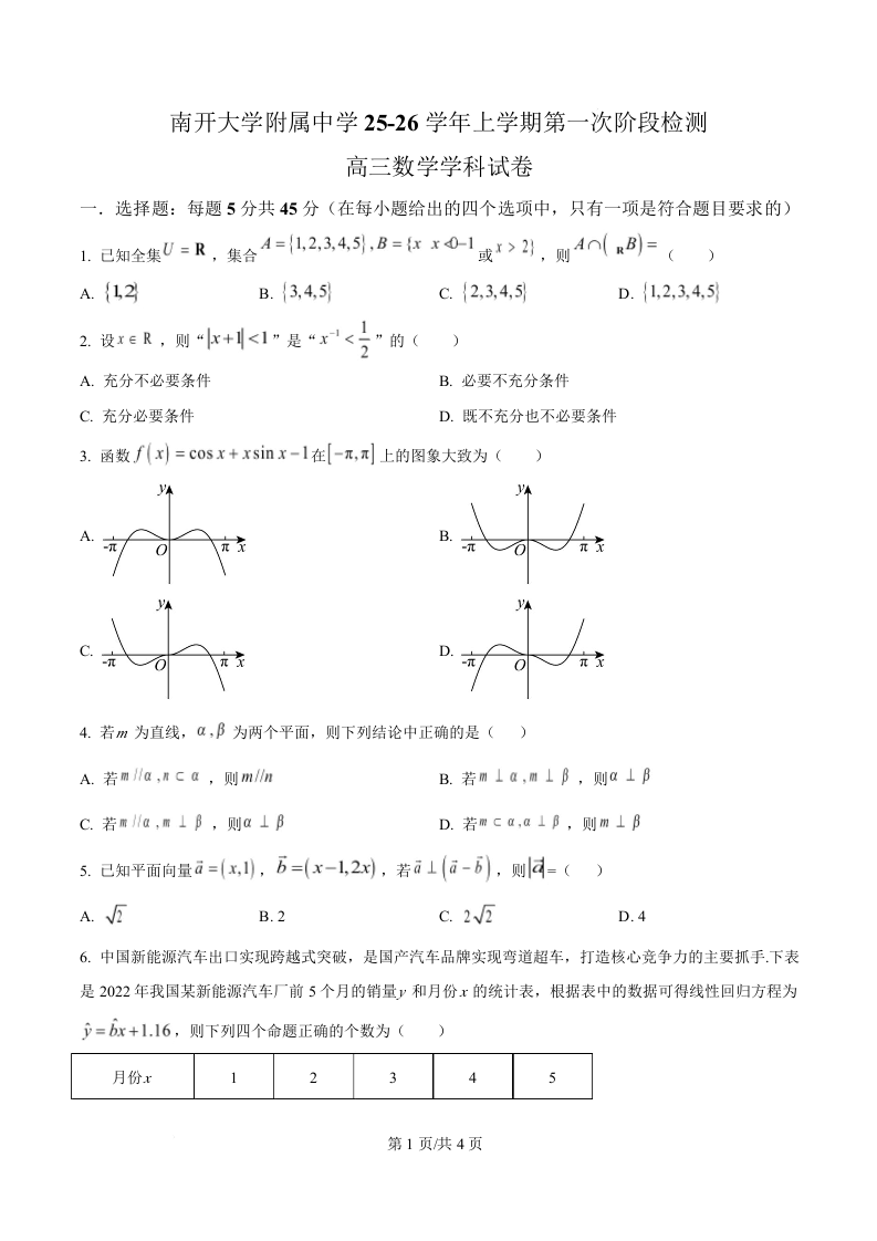 天津市南开大学附中2025年高三上学期第一次阶段检测 数学.docx