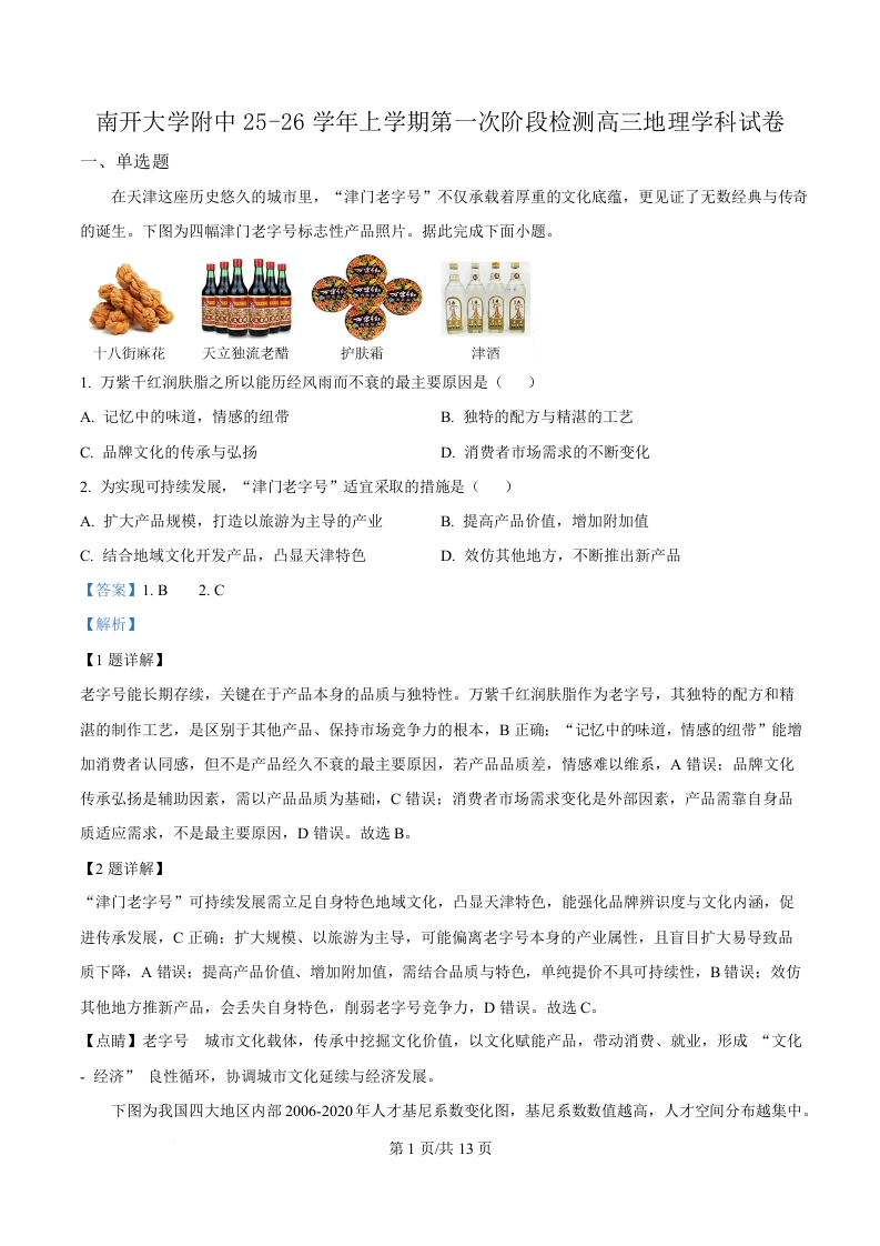 天津市南开大学附中2025年高三上学期第一次阶段检测 地理答案.docx