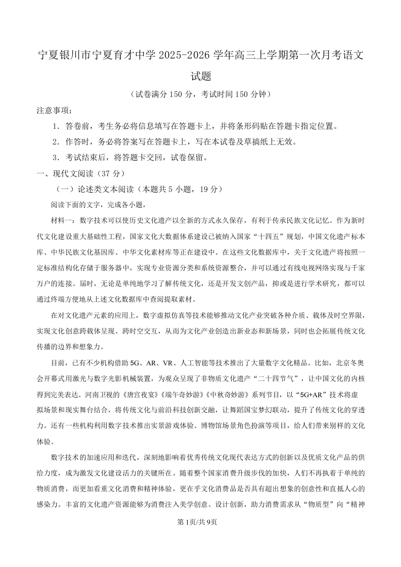宁夏银川市宁夏育才中学2026届高三上学期第一次月考 语文.docx