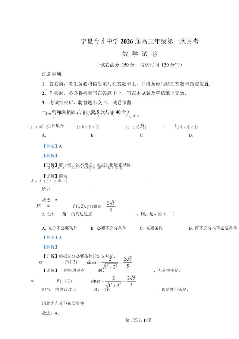 宁夏银川市宁夏育才中学2026届高三上学期第一次月考 数学答案.docx