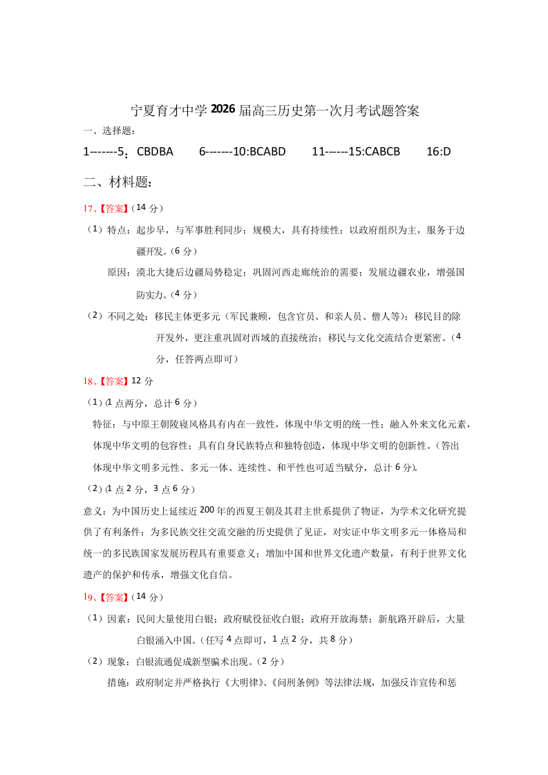 宁夏银川市宁夏育才中学2026届高三上学期第一次月考 历史答案.docx