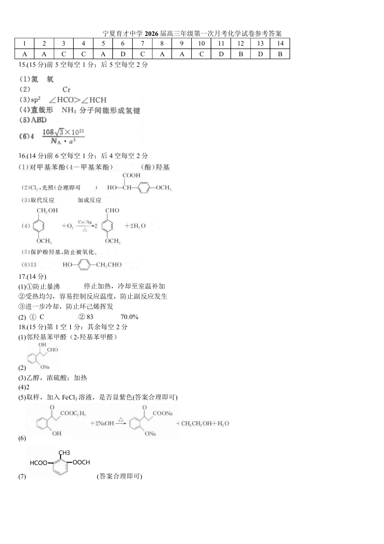 宁夏银川市宁夏育才中学2026届高三上学期第一次月考 化学答案.docx