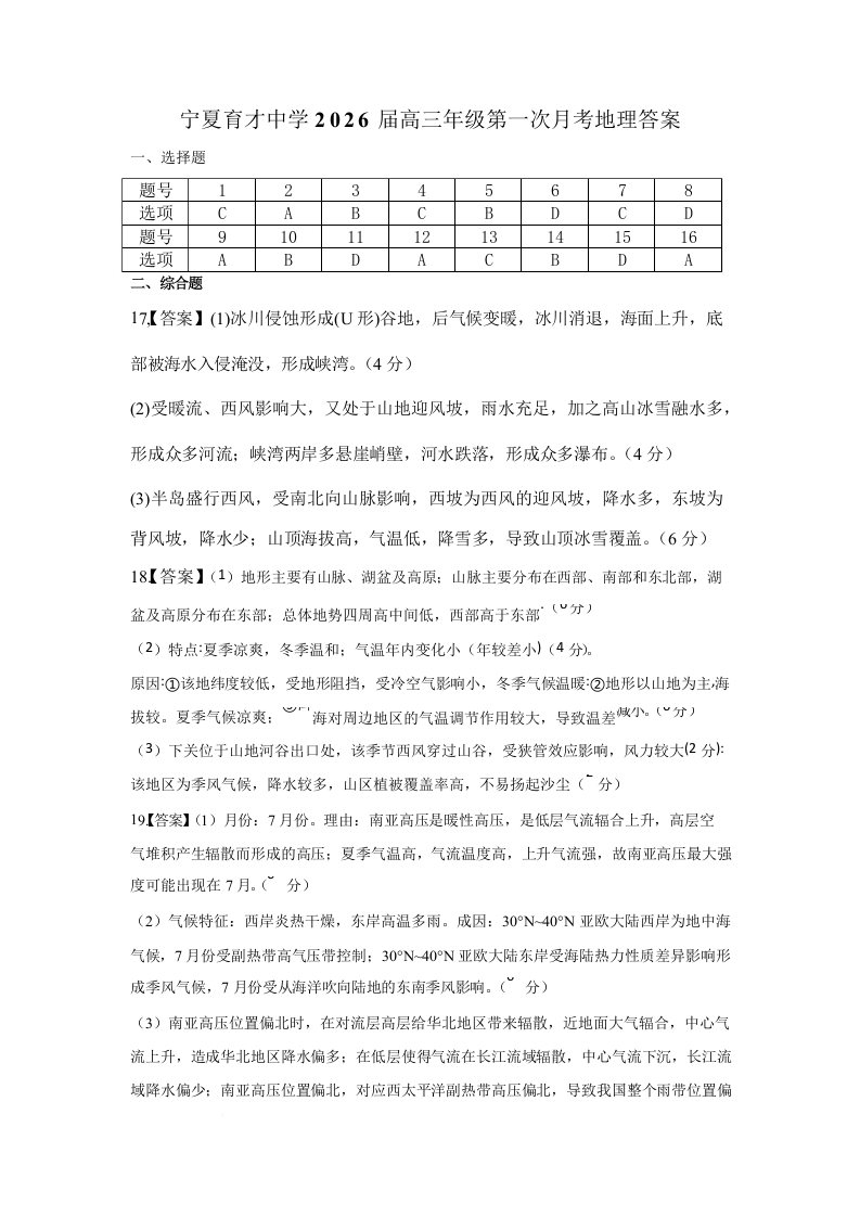 宁夏银川市宁夏育才中学2026届高三上学期第一次月考 地理答案.docx