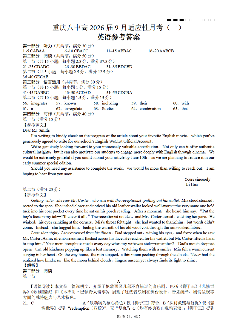 重庆八中高2026届9月适应性月考(一)英语答案.pdf