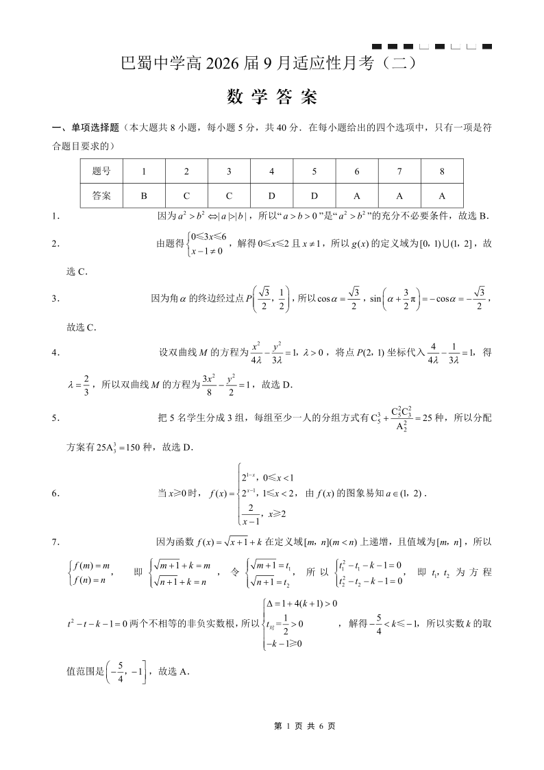 巴蜀中学2026届高考适应性月考卷(二)数学答案.pdf