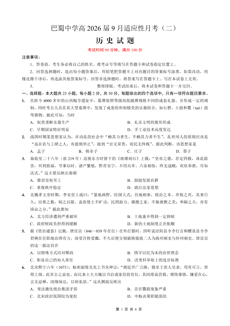 巴蜀中学2026届高考适应性月考卷(二)历史.pdf