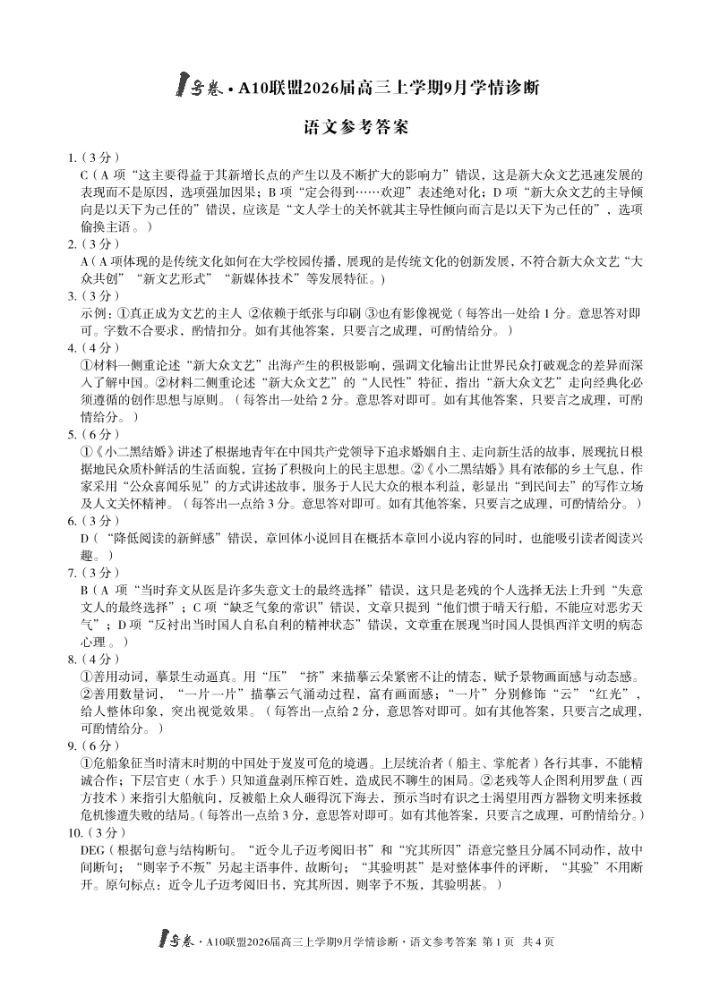 1号卷·A10联盟2026届高三上学期9月学情诊断 语文答案.pdf