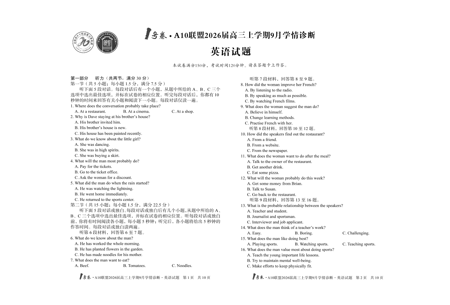 1号卷·A10联盟2026届高三上学期9月学情诊断 英语.pdf