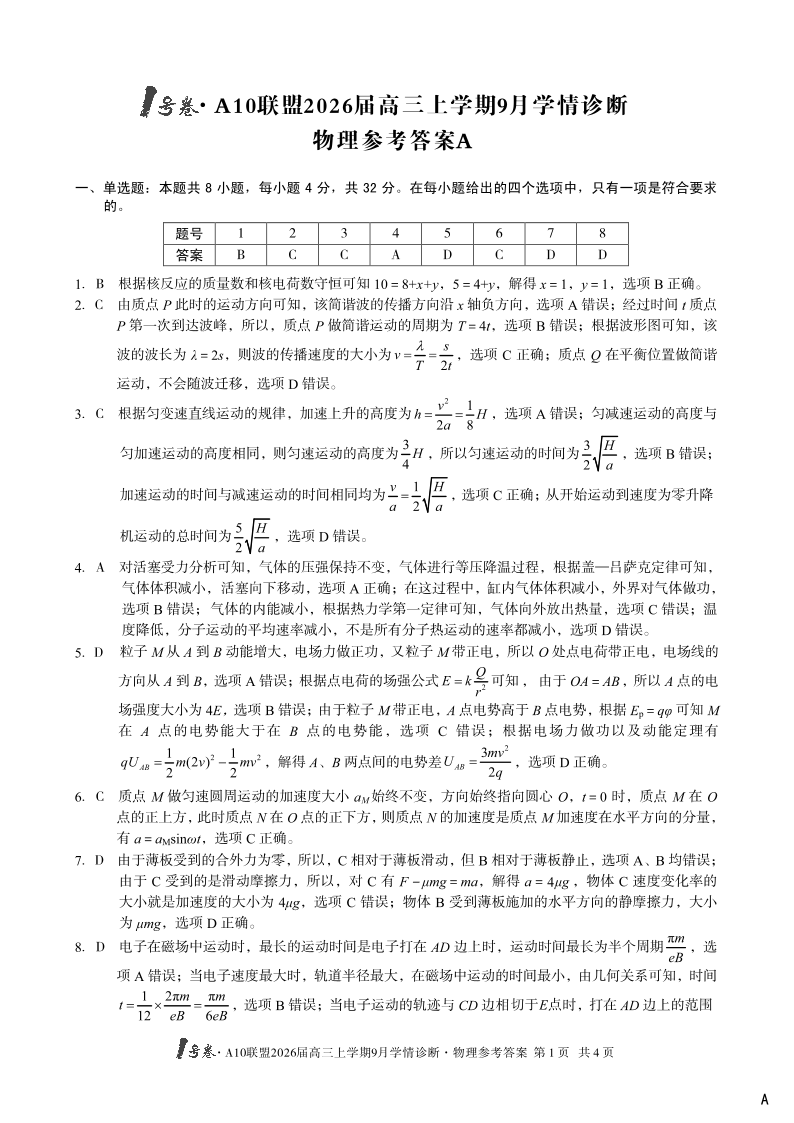 1号卷·A10联盟2026届高三上学期9月学情诊断 物理(A卷)答案.pdf