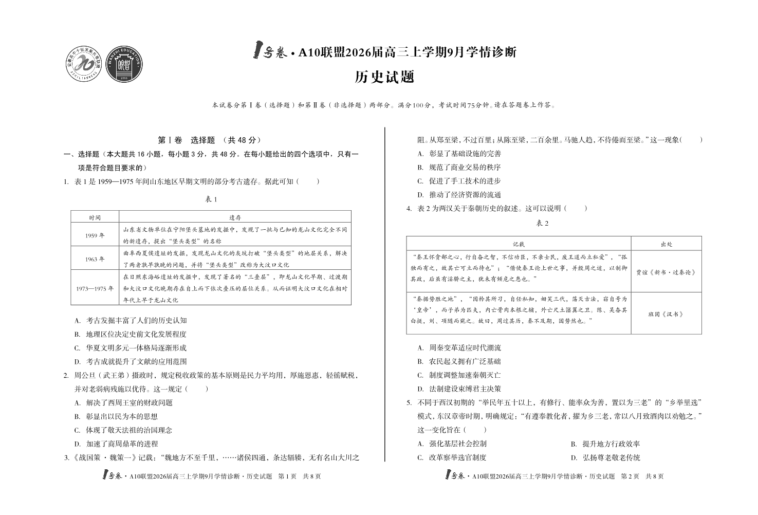 1号卷·A10联盟2026届高三上学期9月学情诊断 历史.pdf