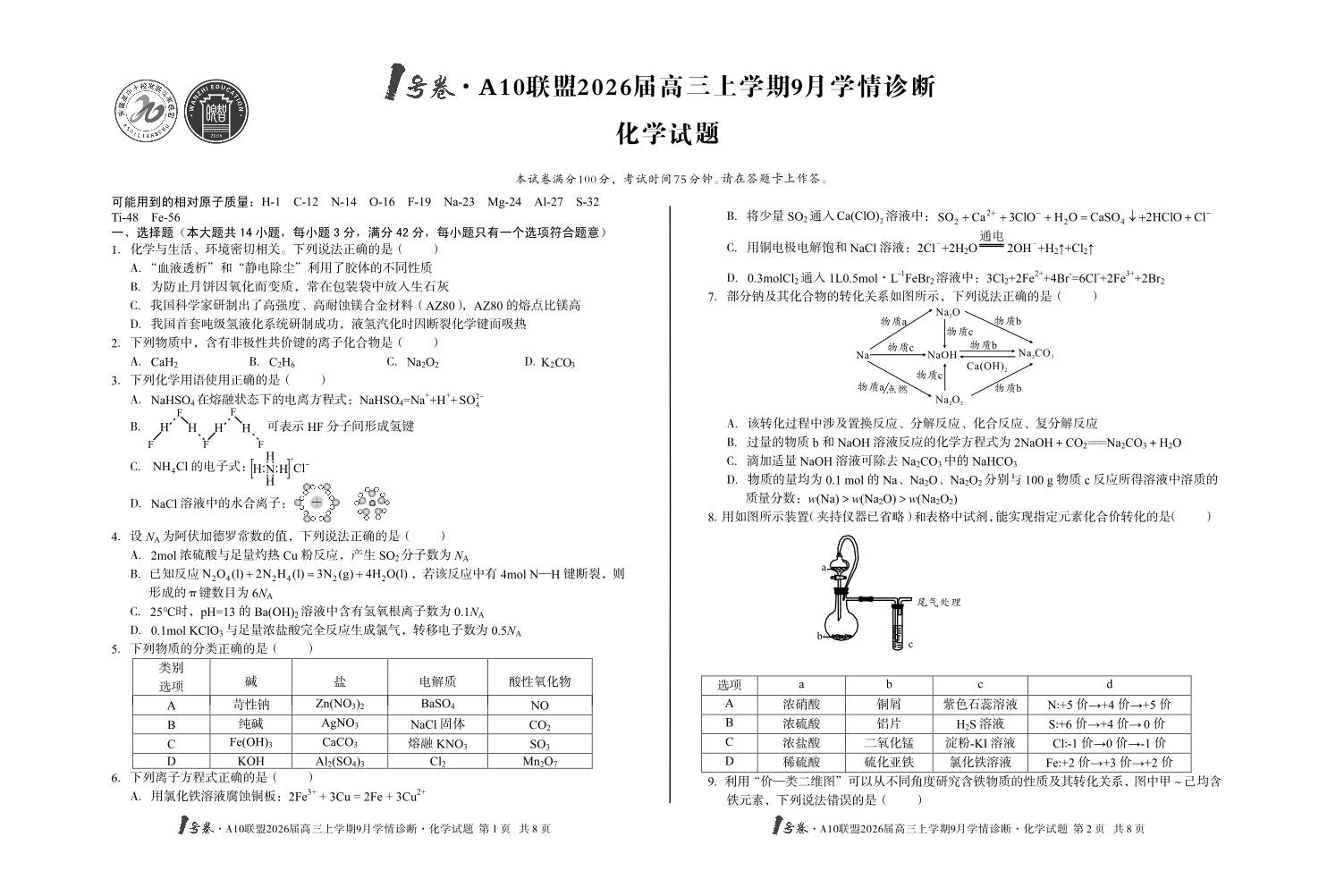 1号卷·A10联盟2026届高三上学期9月学情诊断 化学.pdf