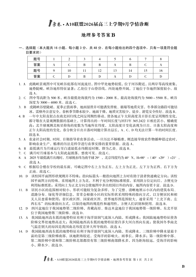 1号卷·A10联盟2026届高三上学期9月学情诊断 地理(B卷)答案.pdf