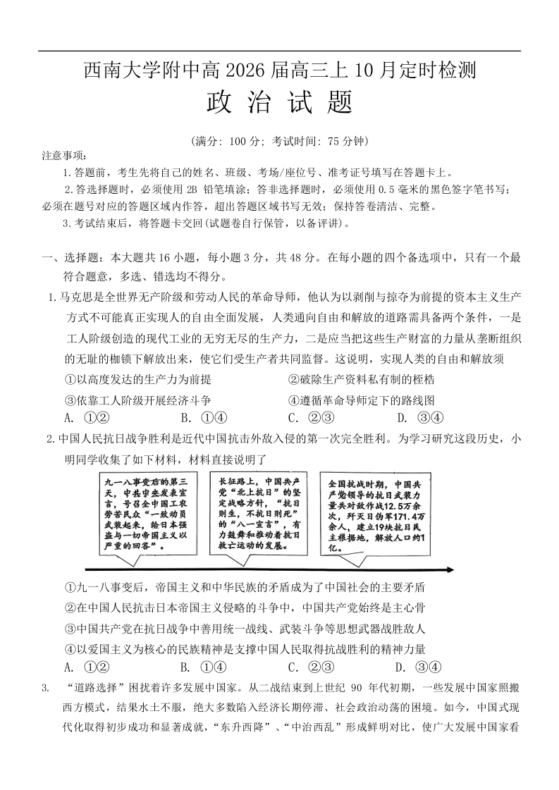 重庆市西南大学附属中学校2025-2026学年高三上学期10月月考政治试卷.docx