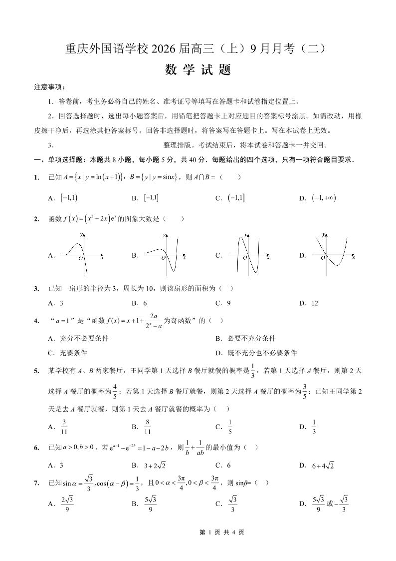 重庆实验外国语学校2025-2026学年度(上)高2026届9月月考(二)数学.pdf