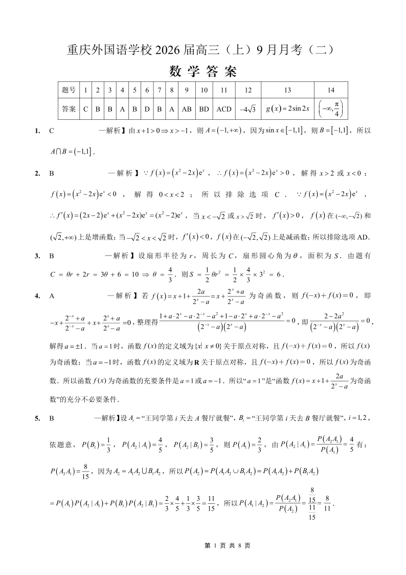 重庆实验外国语学校2025-2026学年度(上)高2026届9月月考(二)数学答案.pdf