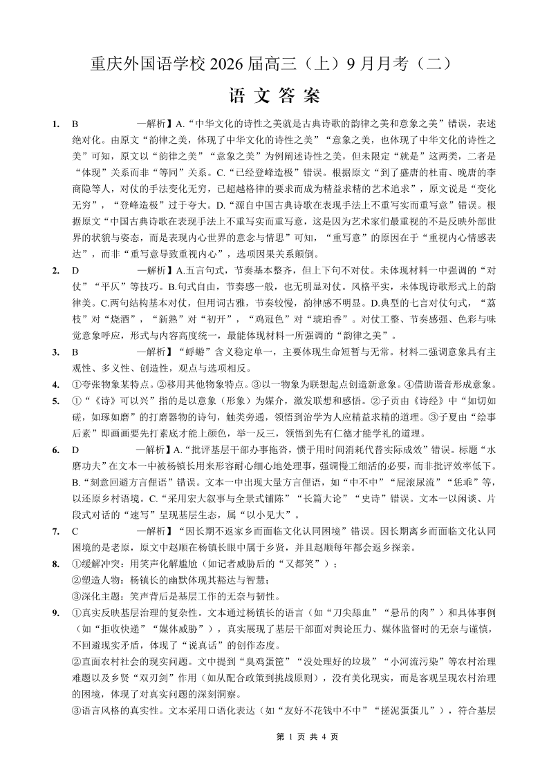 重庆实验外国语学校2025-2026学年度(上)高2026届9月月考(二)语文答案.pdf