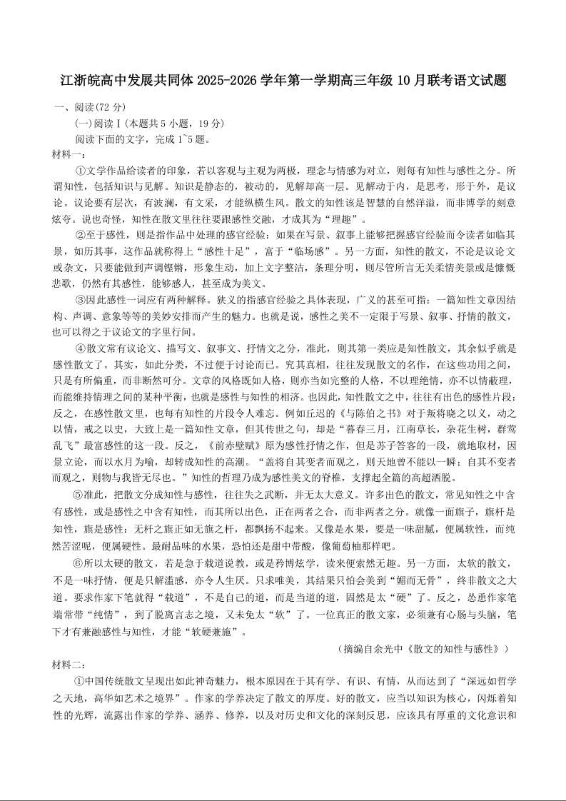 江浙皖高中(县中)发展共同体2025-2026学年高三上学期10月联考语文试题(含答案).docx