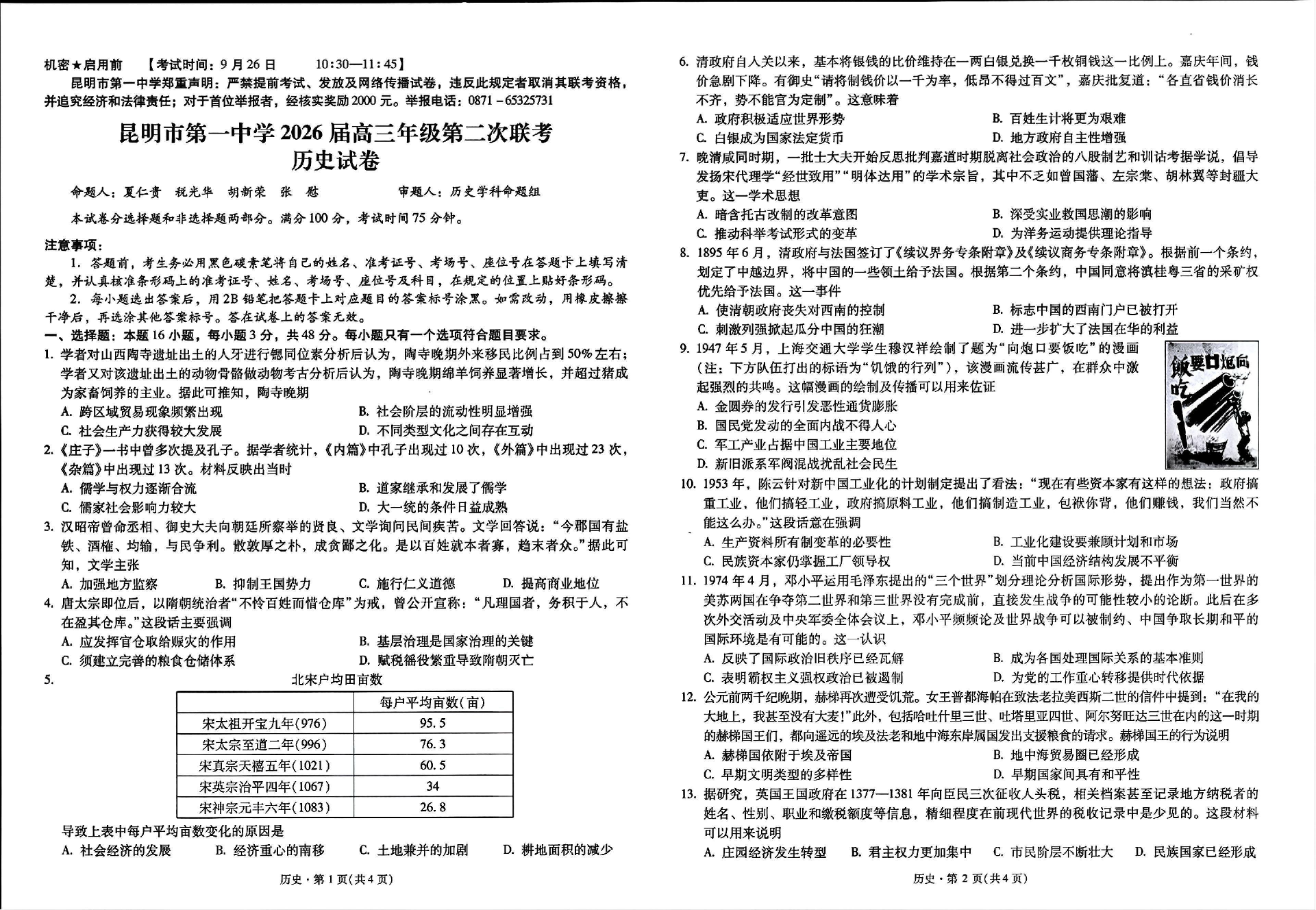 云南省昆明市第一中学2026届高三年级第二次联考历史.pdf
