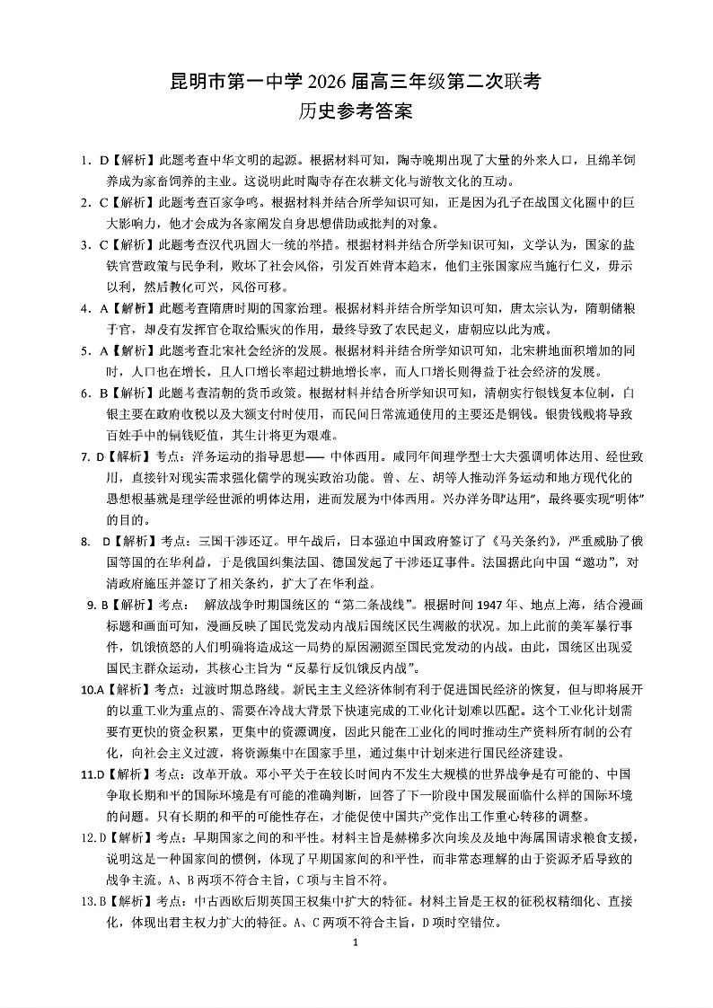 云南省昆明市第一中学2026届高三年级第二次联考历史答案.pdf