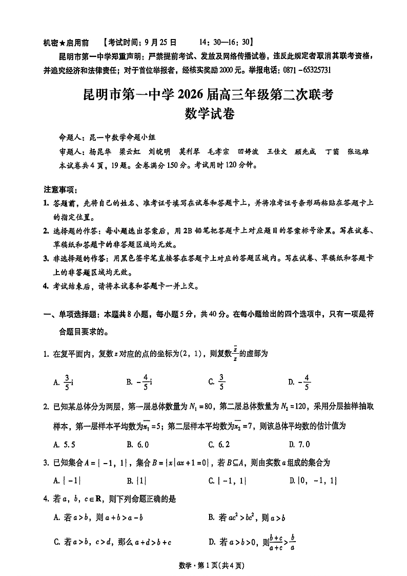 云南省昆明市第一中学2026届高三年级第二次联考数学.pdf