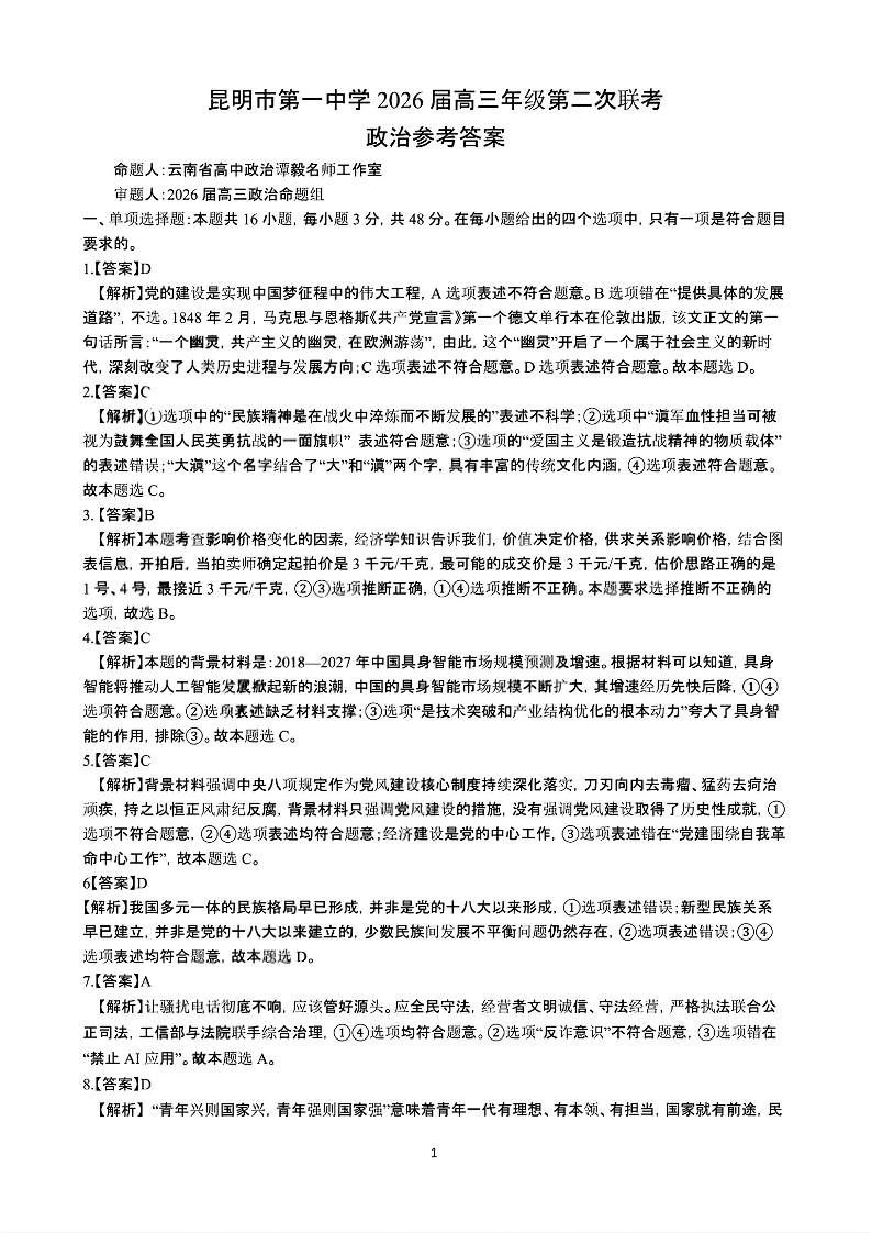 云南省昆明市第一中学2026届高三年级第二次联考政治答案.pdf