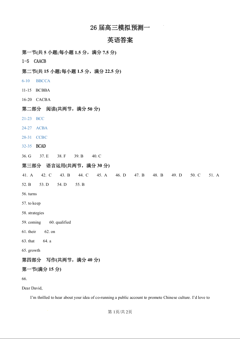 26届高三模拟预测一英语答案.docx