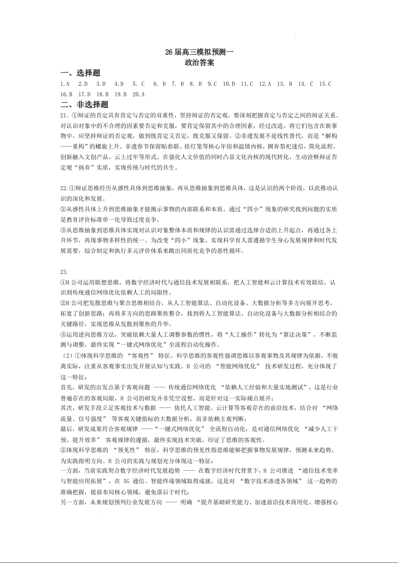 26届高三模拟预测一政治答案.docx