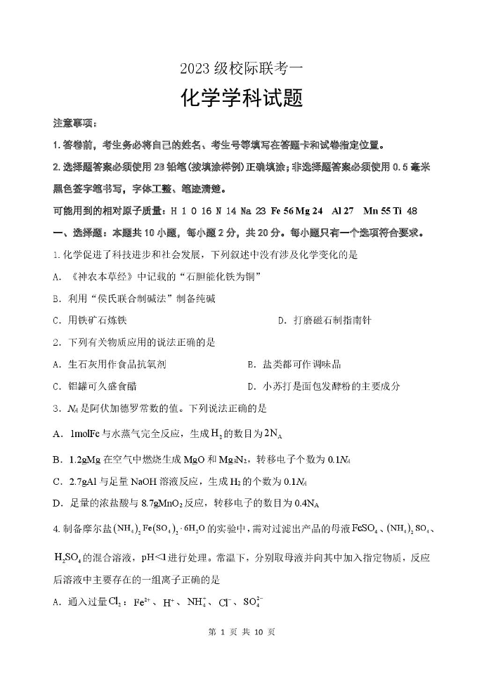 山东省德州市2026届高三上学期9月校际联考(一)化学试卷(含答案).pdf