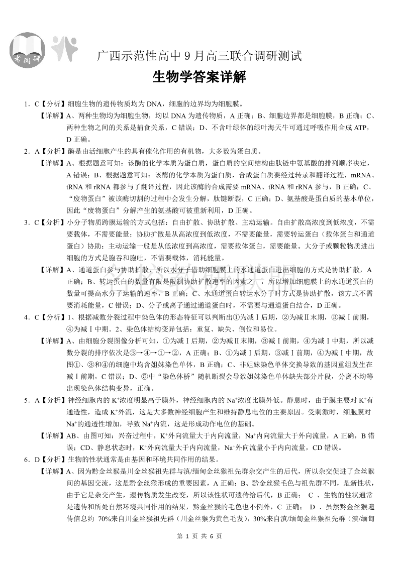 考阅评·广西示高2025年9月高三联考 生物答案.pdf