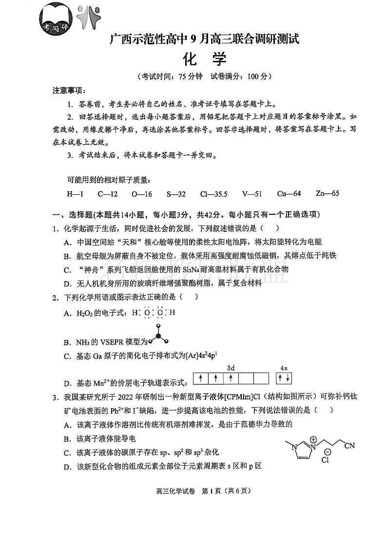 考阅评·广西示高2025年9月高三联考 化学.pdf