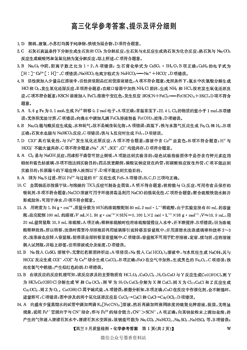 九师联盟2026届高三9月质量检测 化学答案.pdf