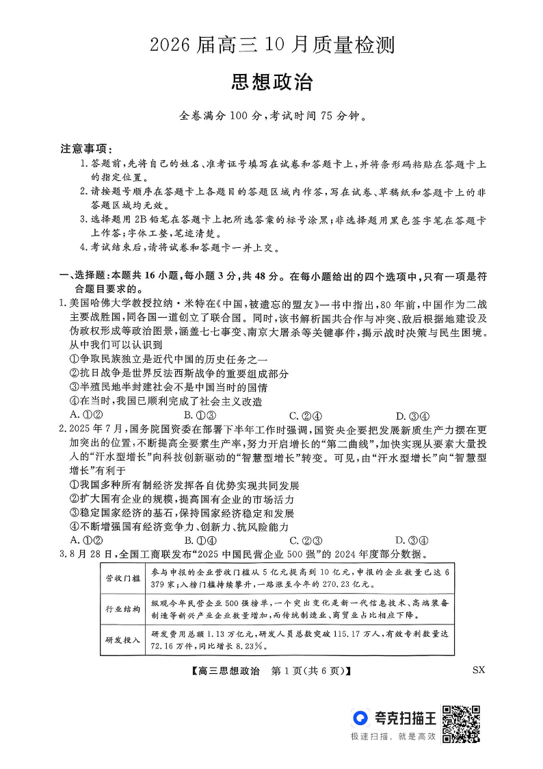 山西省三重教育2026届高三10月质量检测 政治.pdf