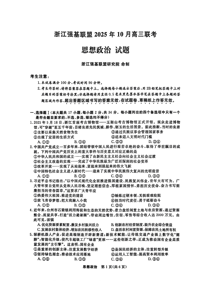 浙江强基联盟2025年10月高三联考 政治.pdf