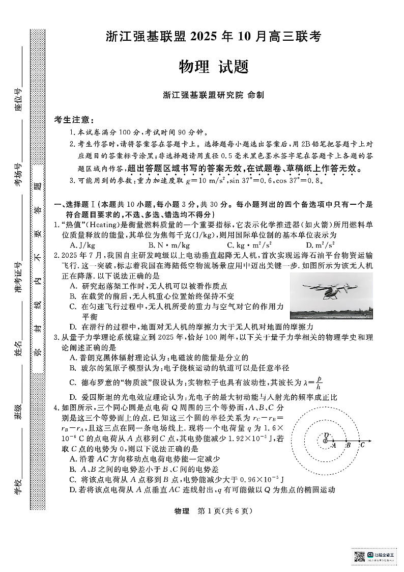 浙江强基联盟2025年10月高三联考 物理.pdf