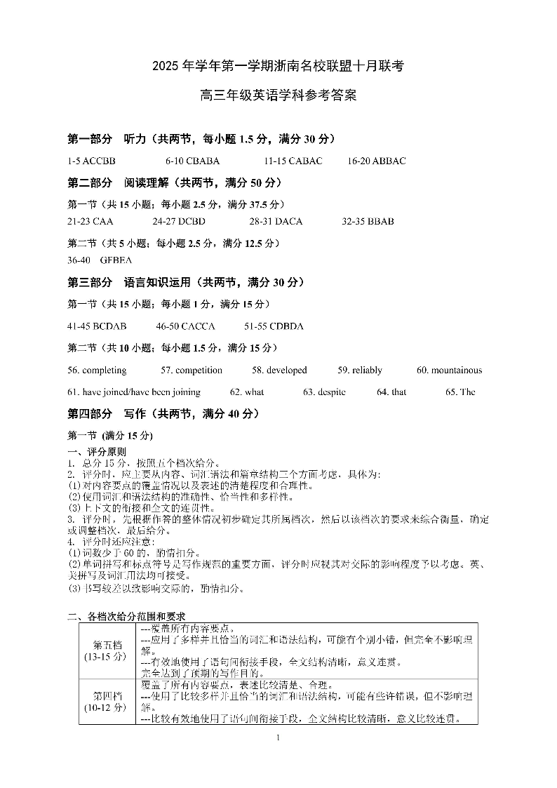 26届浙南名校联盟国庆返校考 英语答案.pdf