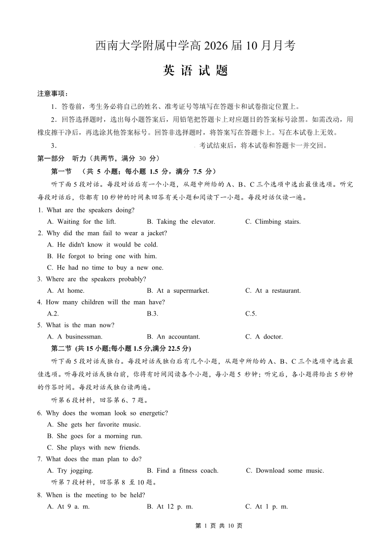 西南大学附属中学高2026届高三10月月考 英语.pdf