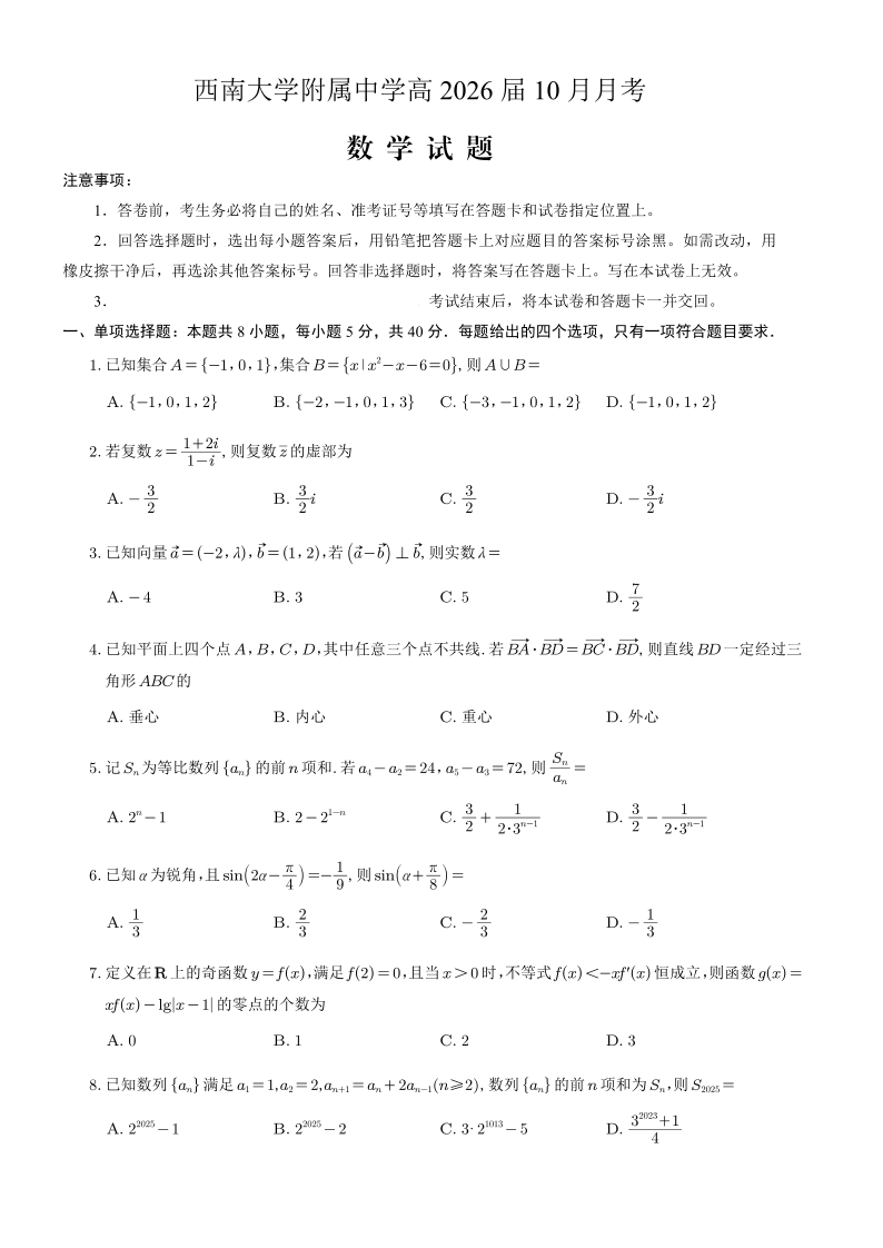 西南大学附属中学高2026届高三10月月考 数学.pdf